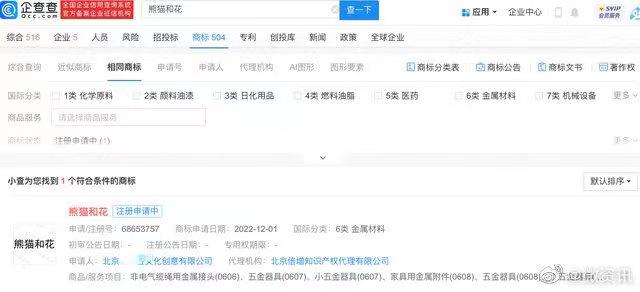 根据企查查APP的信息显示,两家北京文化公司已经申请注册商标“熊猫花花”和“熊猫和花”。相关商标均在2022年11月和12月申请,国际分类包括服装、鞋、帽、科学仪器等。目前,这些商标的状态都是注册申请中。